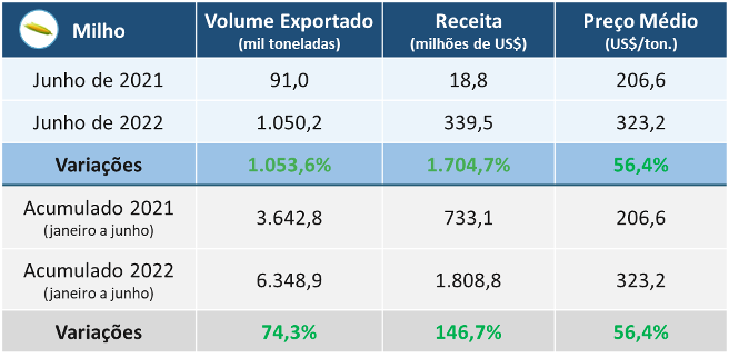 Analisando em detalhe a cadeia do milho, os volumes embarcados do cereal pelo Brasil cresceram 1.053% em junho, superando 1 milhão de t exportadas. Este comportamento é explicado: pelo avanço das colheitas do milho 2ª safra no Brasil; pelo adiantamento destas operações neste ciclo; e pela maior produção do grão em função das boas condições de clima. Como consequência, as receitas também foram bastante superiores, alcançando US$ 1,7 bilhão, e foram impulsionadas por um aumento de 56,4% nos preços médios da tonelada embarcada. No acumulado do ano, já exportamos 6,3 milhões de t de milho (+ 74,3%) e as receitas somam US$ 1,8 bilhão (+ 146,7%).